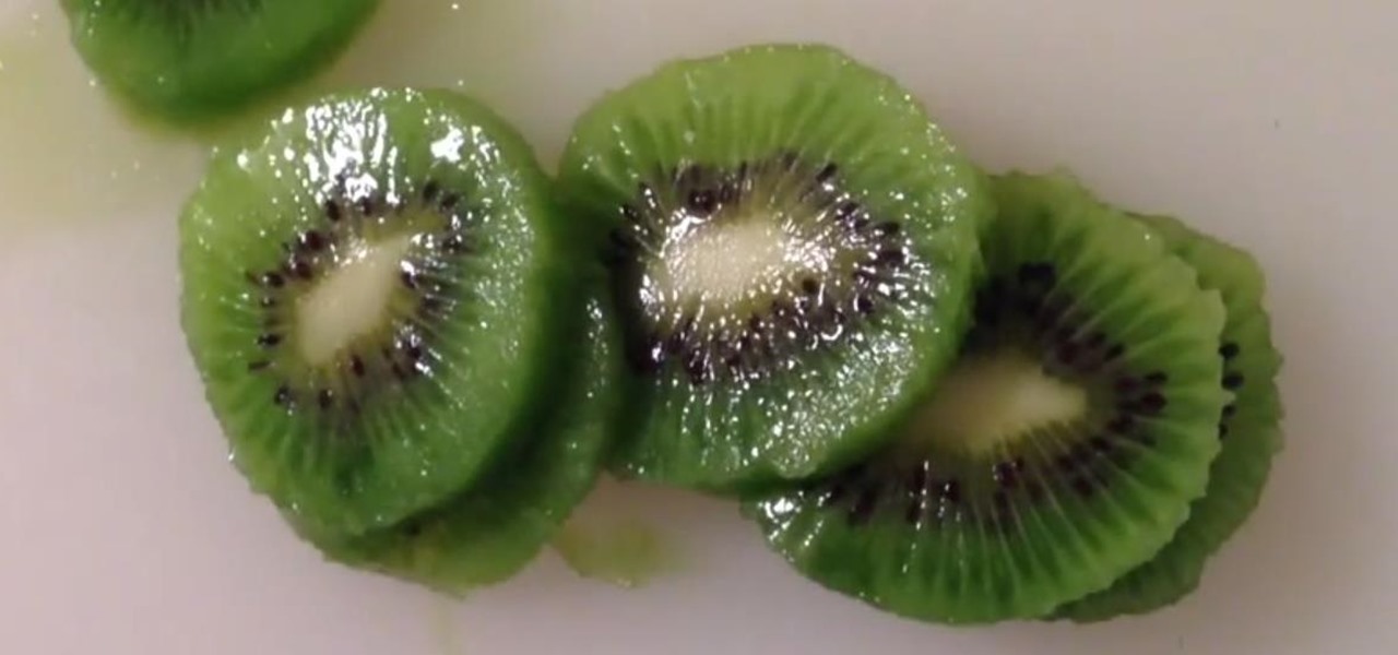 - Add two slice of kiwi fruit at same time adding of base cream on ice cream pan.