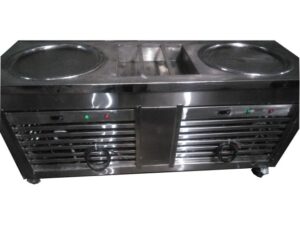 20 inches Round pan roll ice cream machine is the large sized best selling roll ice cream machine. This machine is specially designed for outlets, Restaurants and cafes. This machine works efficiently for making quick ice cream for large gatherings. Our machines are easy to use. This machine is very efficient at producing rolls. The machine is ready to make roll within 1 minute. This machine can be easily moved from one place to another because of its size and movable wheels. The Machine is in budget price. Customization options are available in this segment such as bain-marie, fridge or storage container.